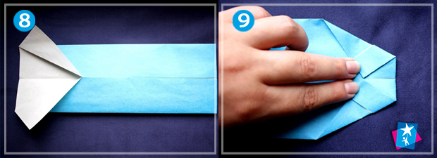 6. Покладіть вашу фігуру комірцем вгору. Нижню частину прямокутника підтягніть під комірець, наскільки це можливо. Добре притисніть лінію згину внизу.