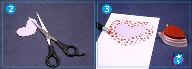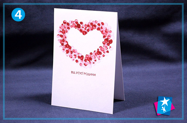 Виріжте невелике серце з клаптика паперу. Прикладіть до заготовки листівки — так ви замаскуєте ділянку у формі серця. Пофарбуйте штемпельною подушечкою круглу гумку на олівці. За межами серця починайте відштамповувати круглі кольорові відтиски резинкою. Можна робити це у кілька шарів.