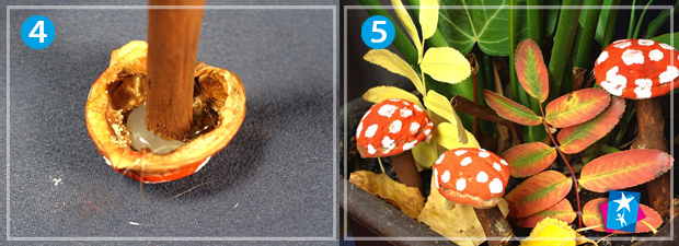 Наступний етап виконайте з дитиною разом. Хтось притримує горіхову шкаралупу, а інший фарбує її у червоний колір за допомогою губки на прищіпці. Це зручно і дозволяє рівномірно наносити шари фарби. Краще зробити два шари кольору. Лишіть червоні шкаралупи підсихати. Після висихання поставте пензликом білі крапочки. Пофарбуйте гілочки у коричневий або білий колір. Коли всі елементи висохнуть, налийте всередину шкаралупи гарячий клей із клейового пістолету та відразу притисніть перпендикулярно "грибну ніжку" з гілочки. Готові вироби вставте в землю для квіткового вазону. Додатково можете прикрасити композицію різнокольоровим осіннім листям.