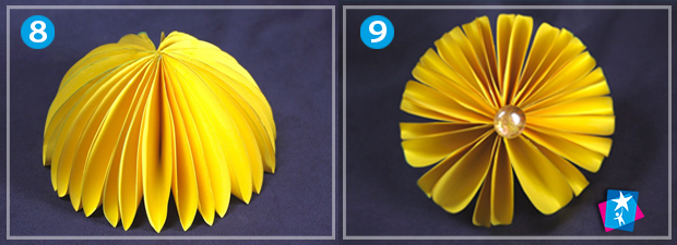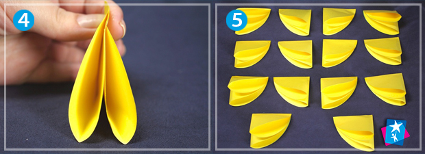 Зігніть по горизонталі та вертикалі. Зовні посередині нанесіть краплину клею і складіть перший елемент майбутньої парасолі, як на фото. Потрібно сформувати пальцями по дві краплеподібні частини в кожному елементі.