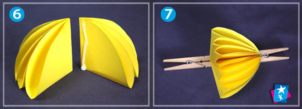 Почніть викладати основну частину парасольки. Склеюйте центральні частини елементів між собою послідовно. Можна розділити всі елементи на чотири купки та притискати прищепками для кращого висихання клею.