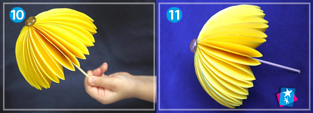 Коли поєднаєте всі частини між собою, прикрасьте парасольку зверху по центру маленькою бусиною або ґудзиком. Для цього етапу зручно використовувати клейовий пістолет. Вставте всередину бамбукову шпажку необхідної довжини. Ваша парасолька готова!
