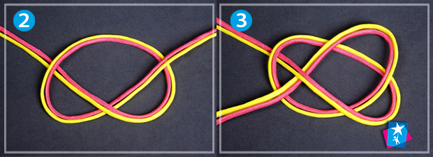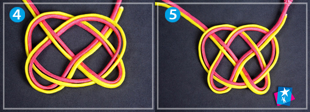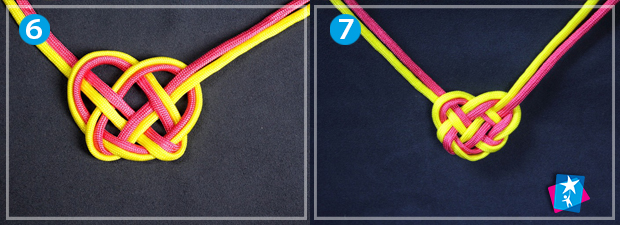 Наступний крок — змінити напрямок кінців внизу та, знову чергуючи, переплітаючи навколо перпендикулярних ліній, то знизу, то зверху проводити хвости до виходу за межі вузла.