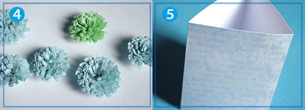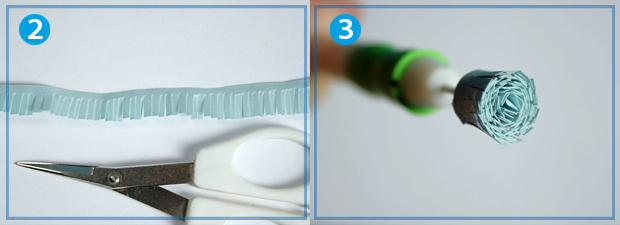 Візьміть смужку для квілінгу у зелених або блакитних відтінках. Довжина смужки має складати 29 см. Манікюрними ножицями обережно наріжте "бахрому" по всій довжині. За допомогою інструменту для квілінгу скрутіть смужку у рол. Спеціальний інструмент для скручування можна замінити звичайною зубочисткою з маленьким надрізом на одному з країв. У цей надріз вставляється кінчик смужки і починається скручування.