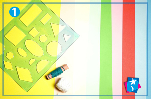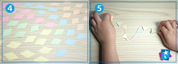 За допомогою трафарету нанесіть на кольоровий папір контури невеликого ромба. Виріжте ці фігури ножицями. "Посадіть" їх на товсту нитку у вигляді трикутних прапорців, склейте всередині. Можна ускладнити завдання для старших дітей, якщо попросити чергувати кольори у певному порядку.
