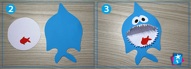 Виріжте і наклейте пару очей, в яких треба поставити цятки фломастером. Приклейте посередині пащу акули, а в ній — маленьку червону рибку. Ось і все — аплікація з об'ємним елементом готова. Можна прикріпити на фон з морською тематикою або залишити, як є.