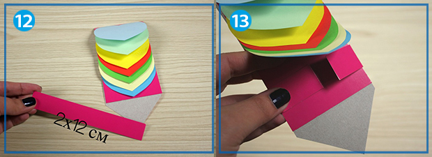 Після того, як приклеїмо верхнє, сьоме серце, перегинаємо основу. Після цього ви помітите нижній шар, який ми перетворимо за допомогою ножиць на кут. Тепер треба взяти смужку картону 2х12 см. Огинаємо смужкою обидва шари основи, склеюємо під сердечками і отримуємо таким чином рухому шлейку.