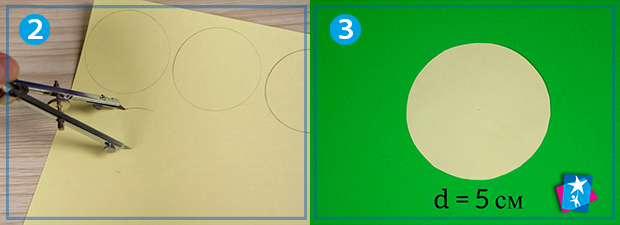 Визначіться, скільки квітів вам знадобиться. Накресліть на аркушах кольорового канцелярського паперу по три кола на кожну квітку. Використовуйте циркуль, встановіть радіус 2,5 см, щоб у кола був діаметр 5 см. У проекті використано сім квітів, тому було накреслено двадцять одне коло. Вирізаємо кола.
