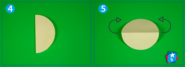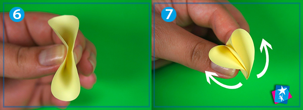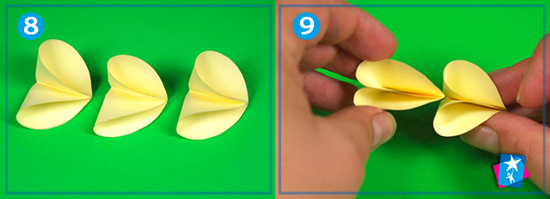 Відкладіть три кола. Кожне зігніть навпіл і пригладьте лінію згину. Викладіть знову у вигляді кола, але таким чином, щоб лінія згину опинилась згори, у горизонтальному положенні. Візьміть кінці лінії згину, притягніть вгору та поєднайте, притискаючи пальцями. Вийде фігура, схожа на об'ємну вісімку, як на фото. Перегніть її кінці в один бік, щоб вийшла фігура-сердечко. Там, де на фото 6 і 7 знаходяться пальці, папір має бути добре притиснутим.