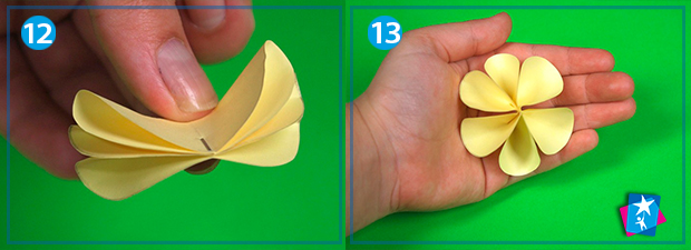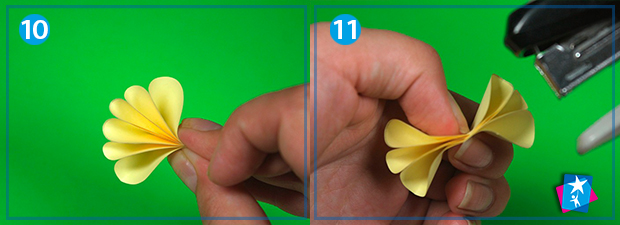 Три пелюстки-сердечка треба вставити одне в одне, тримаючи за кінчик: візуально вийде шість однакових маленьких пелюсток. Їх треба зафіксувати скобою степлера. Для цього розділяємо групу елементів симетрично, в кожен бік по три маленькі пелюстки, і скріплюємо скобою, як на фото 12.