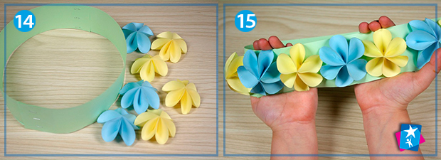 Тепер можна покласти квітку на основу та пальцями розправити пелюстки, надати їм форми. Тепер оберіть декорацію, яку ви прикрасите новоствореними квіточками. Це може бути віночок, для якого знадобиться основа (в проекті використано дві стрічки з паперу по 5х30 см, поєднані між собою відповідно до діаметру голови). Також можна "посадити" квіти на клей на тоненькі бамбукові палички та прикрасити горщики з хатніми квітами, або сформувати букет своїми руками на подарунок. Також за допомогою двостороннього скотчу об'ємні квіточки можна закріпити на стіні, полиці або в будь-якому підходящому місці в будинку. Вибір за вами!