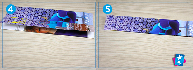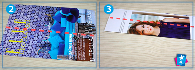 Підберіть журнальні ілюстрації за потрібними кольорами, обережно відірвіть ці аркуші. Покладіть лист тією стороною вгору, що буде лицьовою для майбутньої квітки. Ми обрали насичений синій відтінок.