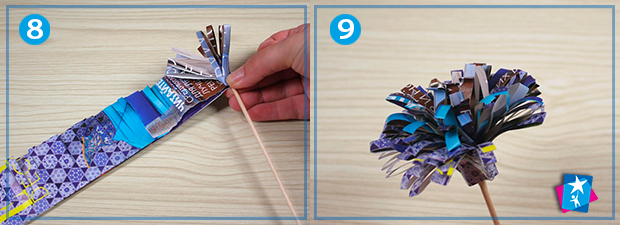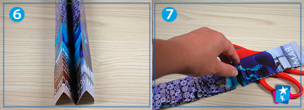 Тепер попрацюйте ножицями. Необхідно нарізати бахрому з тієї частини, що була верхівкою уявної літери "М". Залиште полосу паперу без нарізки шириною не менше 0,5 см. Візьміться за цю полосу та почніть накручувати на бамбукову паличку. Періодично змащуйте палець в клеєві ПВА та проводьте по полосі журнального паперу.