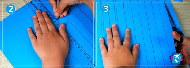Розкресліть аркуш А4 на прямокутники 10,5х2 см, виріжте ножицями. Чим менша дитина, тим довшими мають бути прямокутники — так зручніше буде працювати на етапі склеювання кілець.