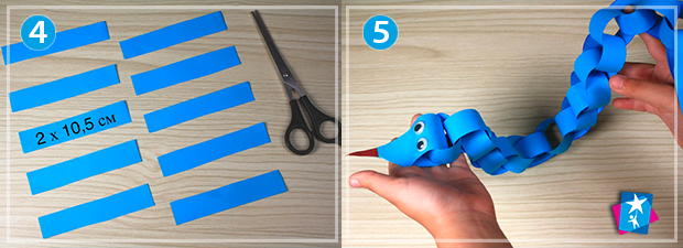 Для виконання завдання малюку знадобиться розкреслити аркуш паперу, вирізати смужки чітко по лініях, склеїти тіло змійки, її голову та хвіст. Це розвиває навики поетапної роботи для досягнення результату: проектування, креслення, вирізання, склеювання тривимірної саморобки у вигляді змії. Описані дії сприяють вдосконаленню моторики пальців та рук.