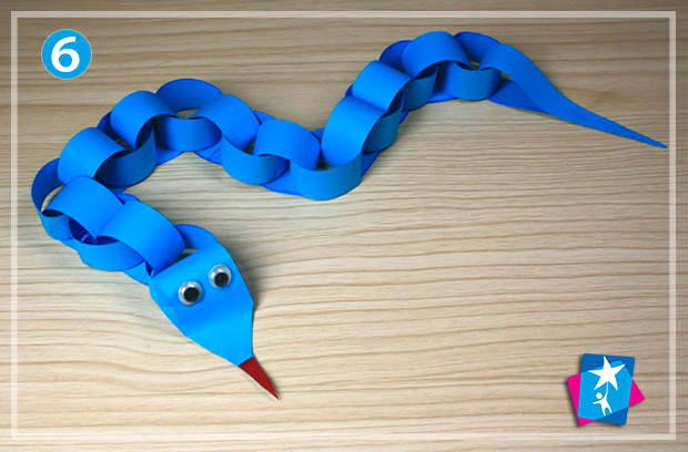 Хвіст роблять із довгої смуги паперу приблизно 17х2 см, яку протягують в останнє кільце ланцюга, склеюють, а після висихання вирізають у формі подовженого хвостика. Голову прикріпляють з іншого боку: шматочок паперу 10х3 см склеюють таким же чином, як хвіст, а потім ножицями надають округлену форму голови змії. Після висихання можна підклеїти знизу червоний зміїний язичок, а очі домалювати або прикріпити штучні очі для іграшок. Тепер можна гратися — змійка рухається і видає приємні звуки: шарудіння нагадує шипіння.