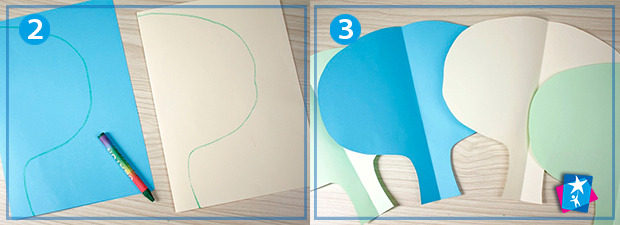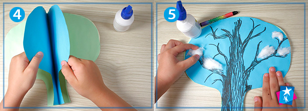 Складаємо кожен аркуш навпіл та малюємо схематичний півконтур дерева. Вирізаємо по цій лінії та розгортаємо паперовий силует. Тепер слід склеїти половинки сусідніх елементів між собою, як на фото 4. Вийде книжечка на чотири розвороти, яку ми і проілюструємо з використанням атрибутів кожної пори року.