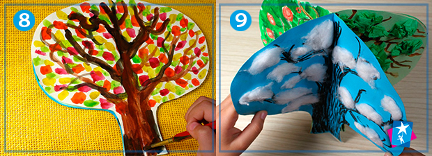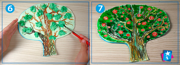Для зими промалюємо темний контур дерева та приклеїмо на гілках невеличкі ватні кульки. Весняному сезону ми вирішили присвятити стовбур в теплих відтінках і невеличкі шматочки креп-паперу, зібрані в гармошку і наклеєні на гілках, що має нагадувати молоде листя. Літо — це яскраві плоди на фоні темно-зеленого листя. Для створення літнього розвороту використані воскові олівці (стовбур та яблука), за рахунок ефекту відштовхування рідини воском на другому етапі наносимо акварель, не хвилюючись за попередній шар: акварельна фарба буде добре лягати на папір та обминати воскові яблучка з гілками. Осіння ілюстрація — це багата червоно-оранжево-жовта гама.