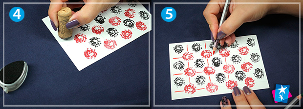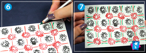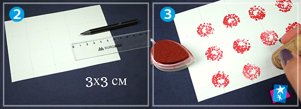 Витріть поверхню штампу і нанесіть чорну фарбу. Потім по центру кожного квадрату проставте темні відбитки. Ви можете обрати будь-які кольори чорнил на власний смак, але буде гарно, якщо вийде виразна контрастна композиція.