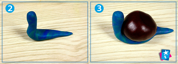 Розімніть шматок пластиліну та розкачайте його в товсту ковбаску зі звуженими кінцями. Зігніть ковбаску, щоб вона нагадувала літеру Г, вкладену на бік. Це буде тіло вашого равлика, встановлене на ногу-підошву. Зверху посередині просто встановіть каштан, який має імітувати мушлю.