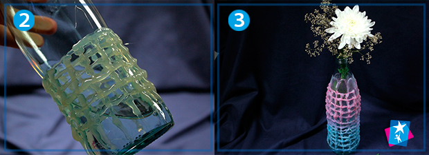 Розігрійте клей-пістолет зі стержнем. Почніть наносити на поверхню пляшки візерунки — це може бути сіточка, як в проекті, або будь-які інші малюнки по вашому бажанню. Термоклей застигає швидко, коли це станеться, можете наносити додаткові шари клею або починати зафарбовувати фактуру. Зручно наносити фарбу губкою, так ви отримаєте рівномірний шар. Кількість шарів фарби необмежена, просто зупиніться, коли вам сподобається інтенсивність кольору.