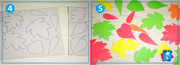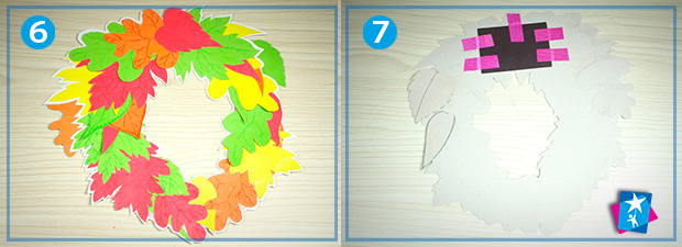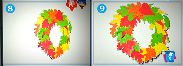 Складаємо пополам лист картону, малюємо два півкола певної товщини. Вирізаємо, щоб отримати основу для вінка. На звороті кольорового картону осінніх відтінків малюємо різноманітне листя. Варіюйте типи та розміри листків, їх нахил (уліво та вправо).