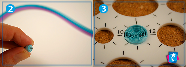 Далі нарізаємо смужку блакитного паперу на відрізки по 7 см. Ці відрізки треба просунути між краплями та поєднати їх кінці у центрі. Допомагайте собі голкоподібним кінчиком шпильки. Склейте елементи між собою: зручно користуватися тонким пензликом, зануреним у краплю ПВА.