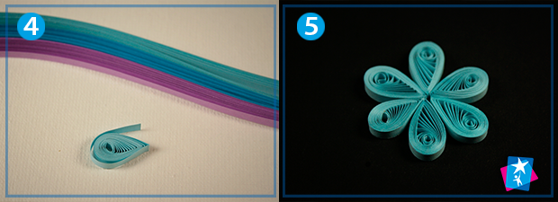 Накрутіть за допомогою стержня блакитну смугу у джгут, тобто тугу спіраль. Обережно зніміть і вкладіть пальцями у отвір на трафареті з діаметром 12 мм. Через кілька секунд заготовка розправиться, після чого її слід вийняти і надати форми краплі. Крапля зображена на мал. 4, а щоб її створити треба просто стиснути пальцями одну зі сторін, вільний кінчик смужки змастити клеєм і зафіксувати на елементі. Модулів-крапель має бути шість, ми їх викладаємо по центру композиції, закріплюємо у потрібних місцях шпильками. В якості основи для викладання композиції використайте міцний аркуш паперу формату А4.