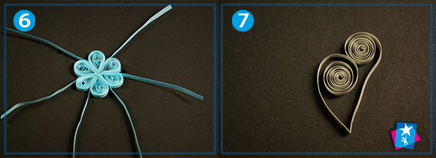 Наступний елемент — серце. Візьміть сріблясту (сіру) смужку, зігніть посередині. Тепер за допомогою стержня накручуйте з кожного боку кінці паперу до лінії згину. Послабте отримані спіралі та викладіть їх, щоб одна була зверху. Всього сердечок має бути дванадцять. Тепер приклейте по два таких елементи між блакитними відрізками: викладайте їх дотичними до кутів, утворених краплею та прямим блакитним відрізком. Шпильки допоможуть тримати загальну форму композиції.