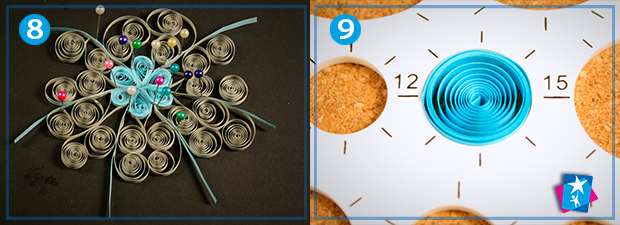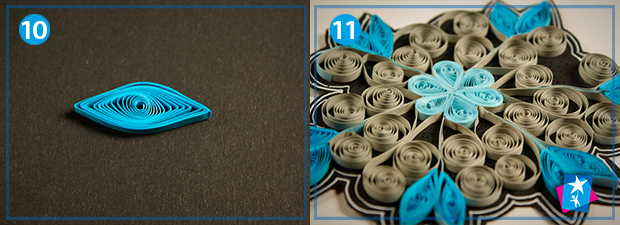 Завершальний етап — створення елементів під назвою "око". Для цього скрутіть із синього паперу спіраль діаметром 15 мм, обережно дістаньте з трафарету та одночасно притисніть пальцями з обох боків на рівній відстані від центру. Таких модулів у формі ока, які ви бачите на фото 10, має бути дванадцять штук. Приклейте їх по обидва боки від блакитних відрізків таким чином, щоб вони торкалися подвійних сірих сердечок.