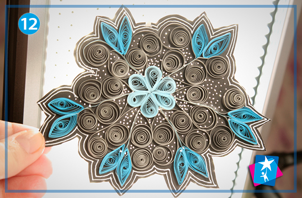 Коли сніжинка на основі буде готова, обведіть її контур, відступаючи кілька міліметрів. Виріжте по контуру. Для більш делікатного орнаменту можете проткнути паперову основу у кількох місцях гострою шпилькою. Все — ваша сніжинка у техніці квілінг готова, можна доповнити стрічкою та прикрасити святковий інтер’єр.