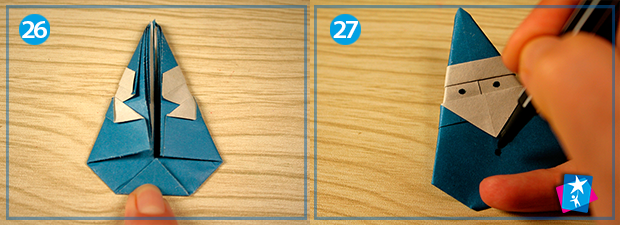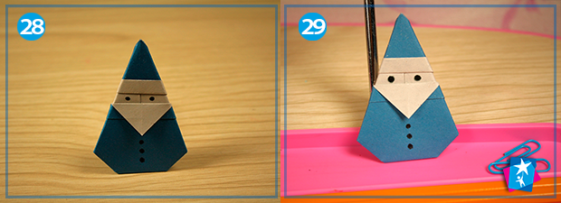 Фото 26 — 27. Залишились останні приготування: витягніть елемент з-під пресу, підгорніть з тильної сторони нижній кутик (фото 26), а потім перегорніть на лицьову сторону та домалюйте фломастером очі й ґудзики вашому Санта Клаусу.