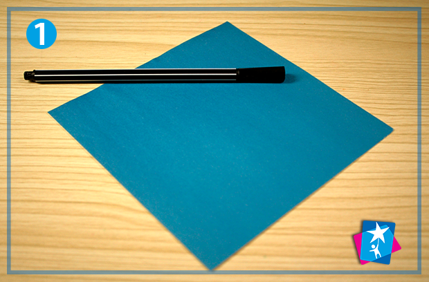 Вкладаємо квадратний аркуш тонкого кольорового паперу 15х15 см на основу. Колір має бути лише з одного боку, тому що світла внутрішня сторона має в результаті поєднатись з темною зовнішньою. Борода і обличчя у героя вийдуть білими, а одяг і шапка — синіми (але ви можете обирати будь-який колір шуби на власний смак).