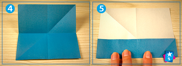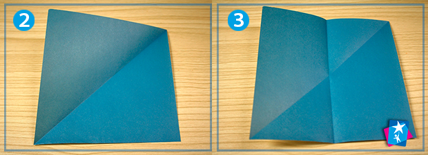 Фото 2 — 3 — 4. Утворюємо лінію згину по діагоналі з нижнього лівого кута до правого верхнього. Розгорнемо та зігнемо квадрат по обох осях симетрії, що проходять через центр, — горизонтальній та вертикальній. Розгортаємо фігуру у квадрат.