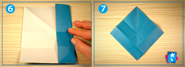 Фото 5 — 6 — 7. Перегортаємо світлою стороною назовні. Нижню грань підтягуємо до центральної горизонталі через верх,  притискаємо лінію згину та повертаємо назад. Таку ж маніпуляцію проводимо із правою гранню, яку треба зігнути посередині та підвести до вертикальної осі. Вкладаємо квадрат темною стороною догори на кут (див. мал. 7).