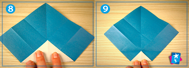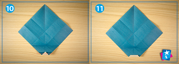 Фото 8 — 9 — 10 — 11. Нижній кут підтягуємо до центру ромбу. Фіксуємо лінію згину, розгортаємо повністю. Нижній кут знову підтягуємо вгору, але цього разу до згину, який ми щойно зробили (мал. 9). На наступному етапі розгортаємо ромб та маленький кутик підтягуємо до останньої лінії згину (мал. 10). Тепер найнижчу частину з загорнутим кутиком треба поділити навпіл по горизонталі та загорнути наверх (див. мал. 11).