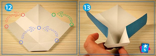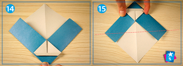 Фото 12 — 13 — 14 — 15. У такому вигляді, як фігура лишилася на останньому етапі, її слід перегорнути світлою частиною назовні. Тепер простим рухом пальців складаємо елемент, поєднуючи кути, як зображено на схемі 12. Пригладжуємо всі отримані згини, щоб вийшов охайний елемент — див. мал. 14. Переверніть елемент таким чином, щоб "капюшон" опинився зверху.