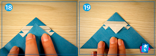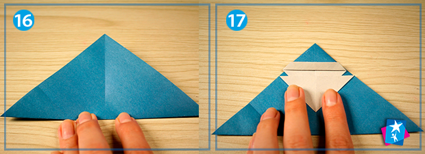 Фото 16 — 17 — 18 — 19. Тепер нижній кут ромбу підтягуємо до верхнього — виходить рівнобедрений трикутник на своїй основі. Ми беремо верхній кутик з зовнішнього шару та трохи відтягуємо вниз, щоб показалась частина обличчя, приблизно тієї ж ширини, що й відворот шапки (мал. 17). Нижній кут знову кладемо нагору, на середину шапки (мал. 18). І опускаємо вниз.