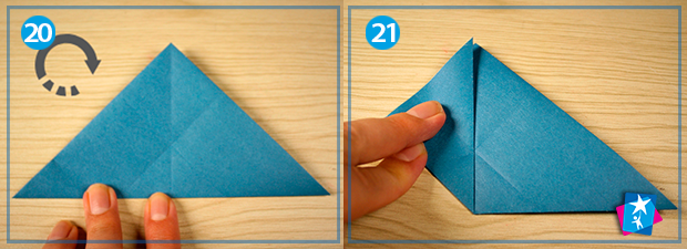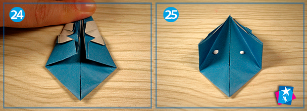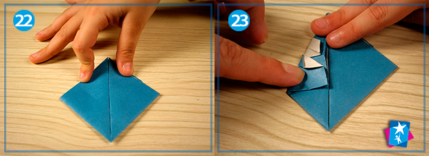 Фото 20 — 21 — 22 — 23 — 24 —25. Перегортаємо трикутник тильною стороною назовні (мал. 20). Починаємо загортати нижні кути основи до верхнього — справа та зліва (мал. 21 та 22). Добре видно вертикальну лінію на зменшеному ромбі: до неї ми повинні загорнути по верху правий та лівий бокові кути ромбу (фото 23 та 24). Можете посадити на клей ці частини фігури, щоб орігамі краще трималося, обов’язково покладіть елемент під прес, наприклад, важку книгу.