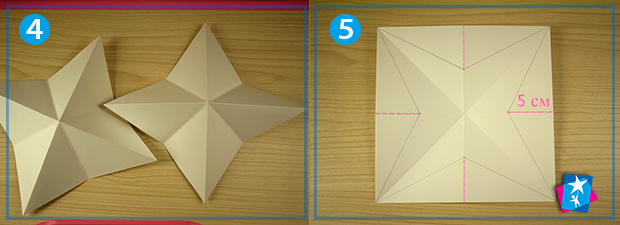 Тепер по осях симетрії треба прокласти відрізки 5 см від краю квадрата (рожевий пунктир на мал. 5). Відмітьте олівцем ці чотири точки. Від цих точок відкладіть відрізки до сусідніх кутів квадрату. Ножицями зробіть надрізи по рожевих пунктирах, а відрізки до кутів стануть лініями згину.