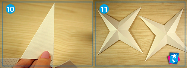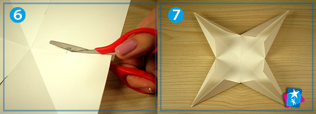 Для створення однієї великої зірки виріжте з акварельного паперу два квадрати 20х20 см. Кожен квадратний елемент зігніть по діагоналях, а також по вертикальній і горизонтальній осях симетрії, що проходять через центр фігури. Кожна лінія згину має бути добре пригладжена, для цього використовують натиск лінійкою по всій довжині лінії.