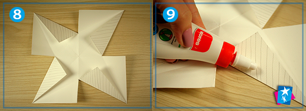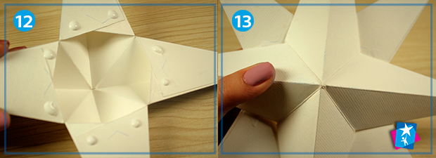 Трикутники, що утворилися після згинання фігури і опинилися у верхньому шарі, заштрихуйте через один. Сюди ви маєте нанести клей. Склеювання проводиться накладанням одного трикутника на інший, при цьому мають вийти об'ємні кінці зірки.