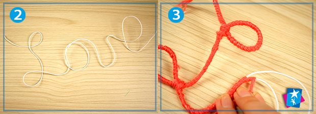 За допомогою пальців викладіть дріт по контуру слова. Тепер почніть намотувати пряжу з одного кінця дроту, залиште вільний кінець нитки трохи довшим. Краще використовувати кілька ниток по 30 — 40 см, так буде зручніше працювати. Місця перетину дроту, в яких поєднуються літери, зв’язуйте в різних напрямках. Не страшно, якщо напис у процесі трохи розкрутився, на фінальному етапі ви зможете знову надати йому бажану форму. Щоб закріпити кінці нитки з обох боків, використайте краплі розігрітого термоклею. Після застигання клею все триматиметься на місцях, непотрібне відріжте. Якщо треба, намотайте ще один шар пряжі.