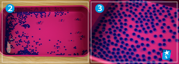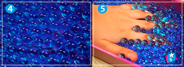 Замочіть гранули гідрогелю водою. Залиште на кілька годин. Коли вода вбереться і кульки стануть великими, дозвольте дитині погратися з прохолодними вологими елементами.