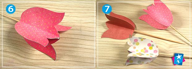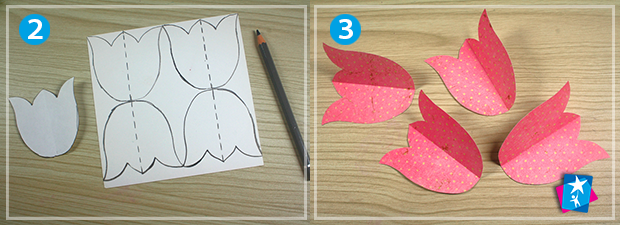 Створіть невеликий шаблон у формі квітки: виріжте квадрат 7х7 см, зігніть навпіл по вертикалі та промалюйте контур половини тюльпана. Виріжте і розгорніть шаблон. Прикладайте до кольорових аркушів квітку-шаблон та обводьте її олівцем зі звороту. Таких елементів має бути по чотири штуки для кожного дизайну скраппаперу, тобто для трьох об'ємних квітів потрібно вирізати 12 пласких тюльпанів.