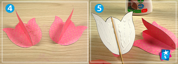 Одну з половинок квітки змажте клеєм ПВА зі звороту, прикладіть бамбукову шпажку, накрийте другою половинкою, придавіть пальцями. Зробіть таким чином три квітки. Підклейте продовгувате листя на стовбури.