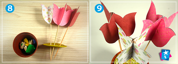 Візьміть маленький горщик для рослин та вкладіть на дно трохи пластиліну або піску. Це робиться для того, щоб надійно зафіксувати кінці бамбукових шпажок. Встановіть ваші квіти й насипте до верху горщика піску, дрібних камінців або тоненьких паперових спіральок, щоб композиція виглядала довершено. А ще можна сховати вміст горщика таким чином: вирізати з фоамірану коло діаметром як верх ємкості, проткнути цей м'який шар шпажками і далі встановити квіти в пластилін або пісок.