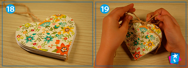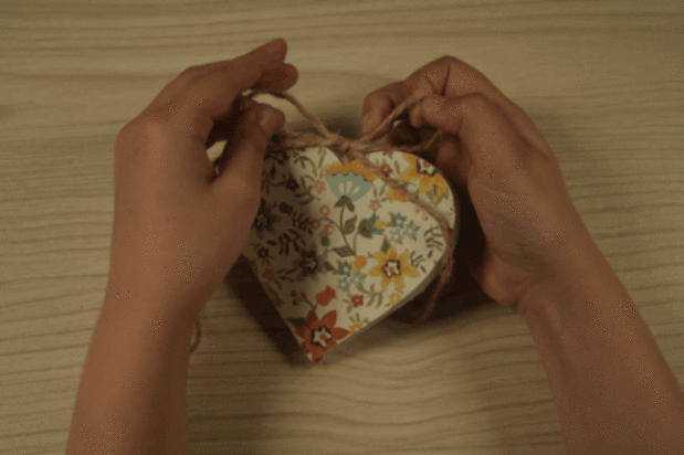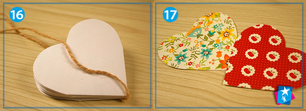 Дістаньте стрічку або тонкий декоративний шнур, обвийте серце таким чином, щоб вільні кінці опинилися зверху (фото 16). Виріжте з картону або скраппаперу обкладинки, приклейте з обох боків. Можете зав’язати мотузочки у вузол або на бант. Спробуйте відкрити кожне віконце та поспостерігати за цікавим ефектом.