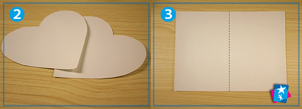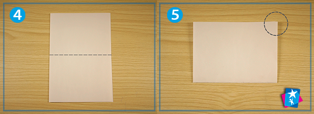 З першого альбомного аркуша виріжте шаблон у формі серця — такої величини буде ваш блокнот в складеному вигляді. Підготуйте ще один альбомний лист, розташуйте горизонтально. По вертикальній осі симетрії складіть, пригладьте лінію згину. Тепер отриманий чотирикутник складіть пополам по горизонталі. Ви отримаєте невеликий прямокутник, як на фото 5. В правому верхньому куті, поміченому пунктирним колом, сторінки мають розкриватися.