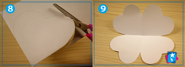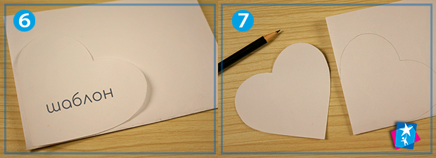 Прикладіть до лівого нижнього кута шаблон-серце. Обведіть, як на малюнку 7. Виріжте. Розгорніть. У вас вийде елемент у вигляді листочка конюшини. Таких елементів зробіть рівно стільки, скільки хочете бачити сторінок у блокноті. Для першого виробу можете обмежитися 3 — 4 сторінками.